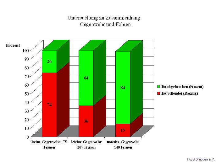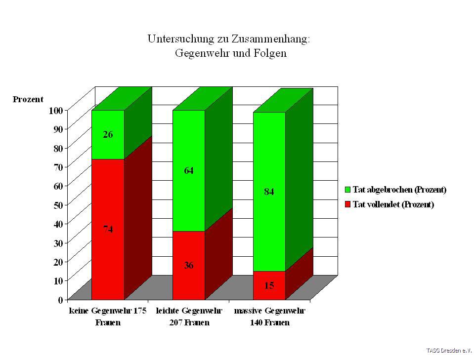 Keine Gegenwehr – leisteten 175 Frauen (= 33%): Die Täter erreichten in 74 % der Fälle ihr Ziel und in 26 % der Fälle ließen sie vom Opfer ab (z.B. weil zufällig unbekannte Dritte dazu kamen)